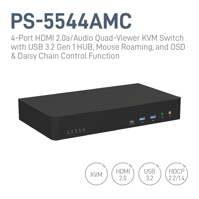 4-Port HDMI 2.0/Audio Quad-Viewer KVM Switch with USB 3.2 Gen 1 HUB, Mouse Roaming, and OSD & Daisy Chain Control Function